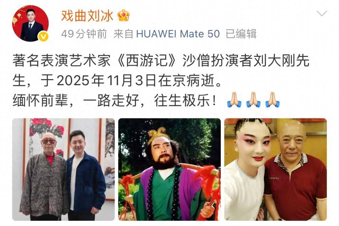 11月7日,戏曲演员@戏曲刘冰 发文:“著名表演艺术家《西游记》沙僧扮演者刘大刚先生,于2025年11月3日在京病逝,享年78岁。”